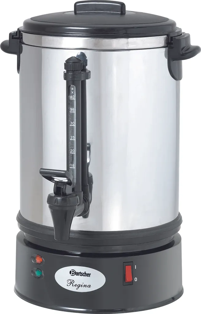 Rundfilterkaffeemaschine REGINA MODEL – Edelstahlgehäuse – Kunststoffboden & Deckel – Fassungsvermögen: ca. 48 Tassen – Inhalt: 6,8 l – Zubereitungszeit: 45 min ca. 6,8 l – Füllstandsanzeige – Anzeige Entkalkung – 2 separate Heizsysteme versickern und warm halten -1,2kW – 230 V