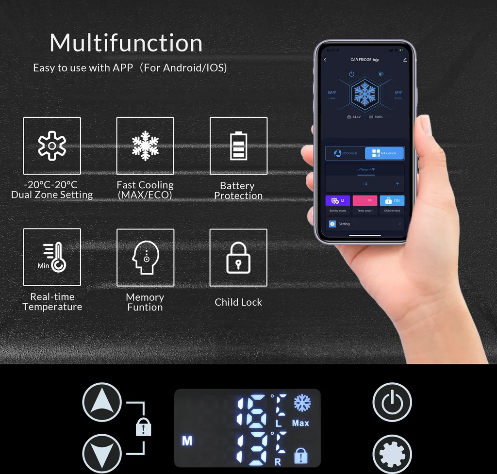 🌱【Benutzerfreundliche Konfiguration】Dieser Autokühlschrank unterstützt Bluetooth-App-Steuerung und LED-Bildschirmsteuerung. Der QR-Code dieser App wird nicht im Handbuch angezeigt, bitte scannen Sie das Bild der Produktbeschreibung oder wenden Sie sich an den Händler, um den QR-Code zu erhalten. Benutzer können diesen Autokühlschrank mühelos mit den beiden oben genannten Methoden steuern. Es gibt sechs Hauptfunktionen für den Betrieb, um den verschiedenen Anforderungen im täglichen Gebrauch gerecht zu werden.