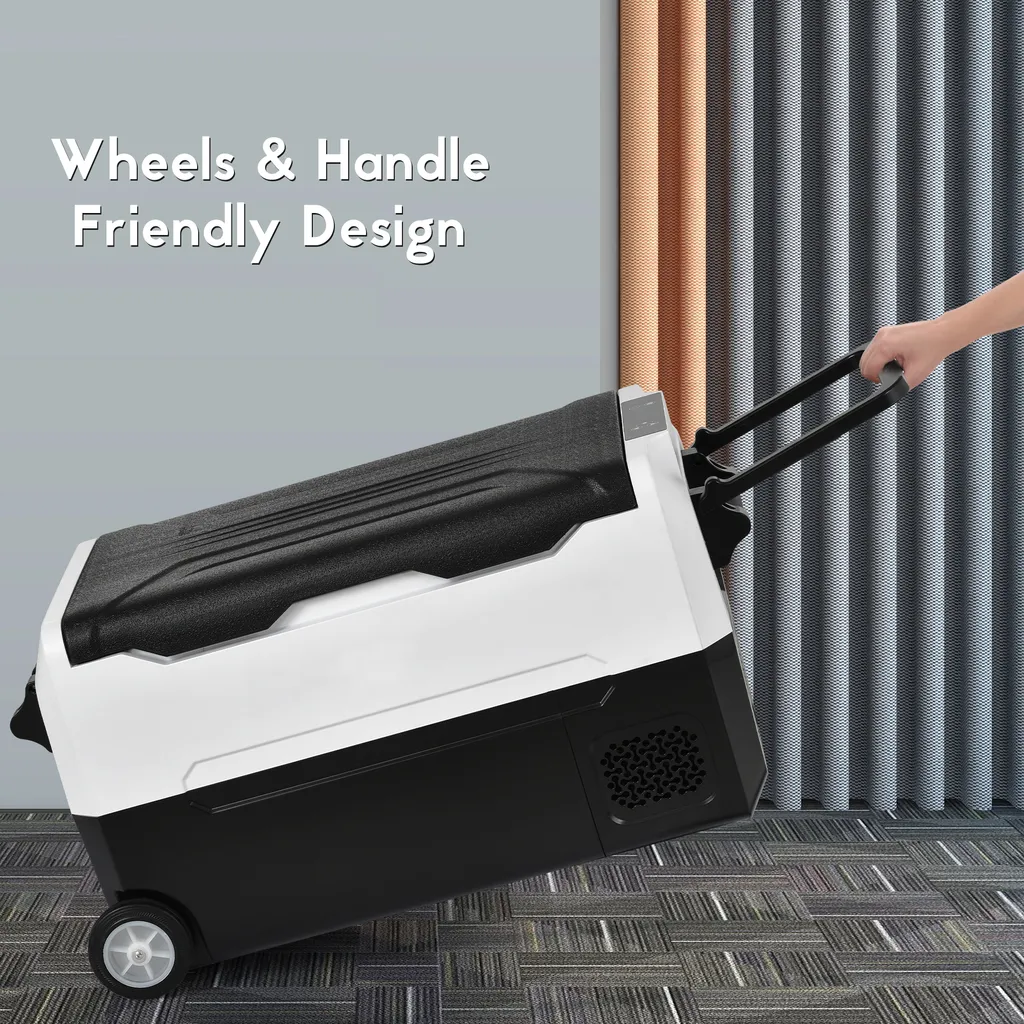 - Dieser Autokühlschrank ist mit Rollenrädern und einem Griff ausgestattet, um eine reibungslose Bewegung zu ermöglichen.