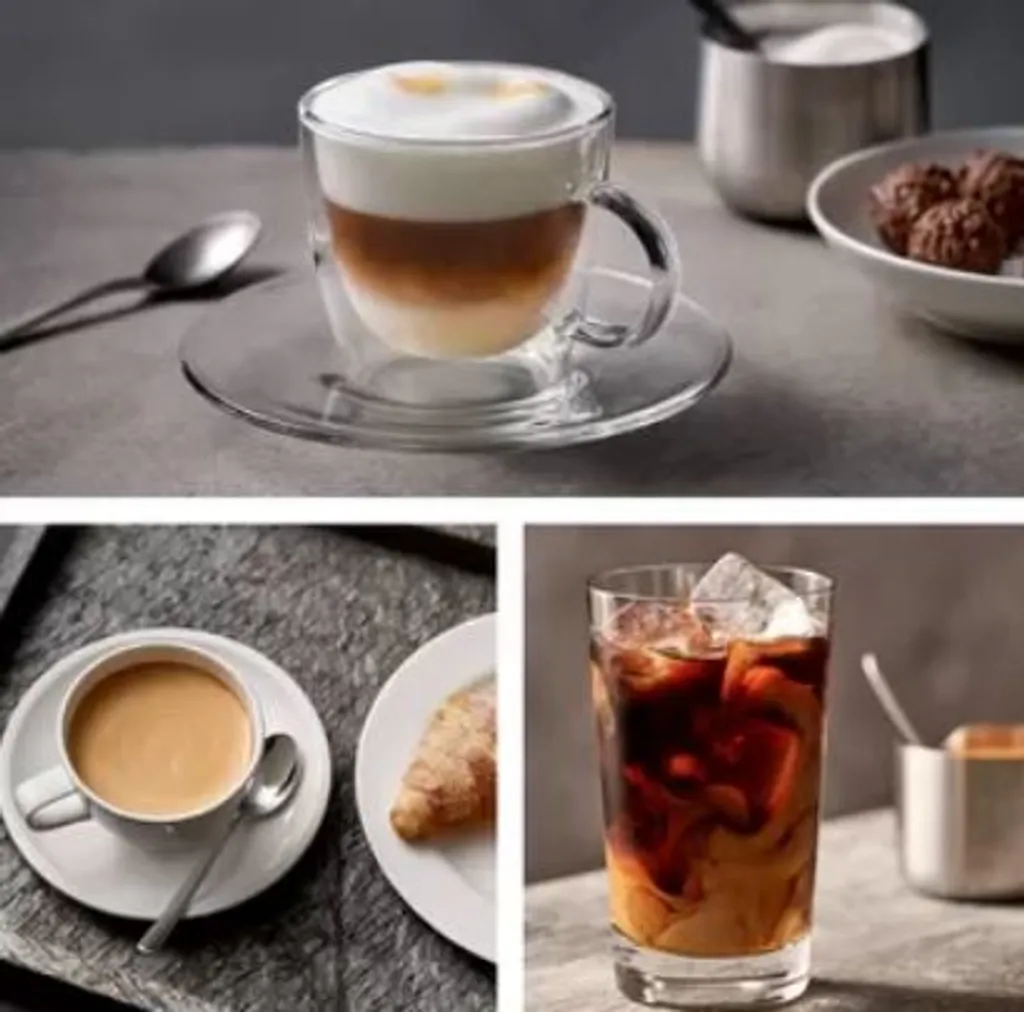– Liste der Milchgetränke, die mit dem Druck einer Taste ohne Bewegen der Tasse erhalten werden können: Cappuccino, Flat White, Latte Macchiato, Milchkaffee