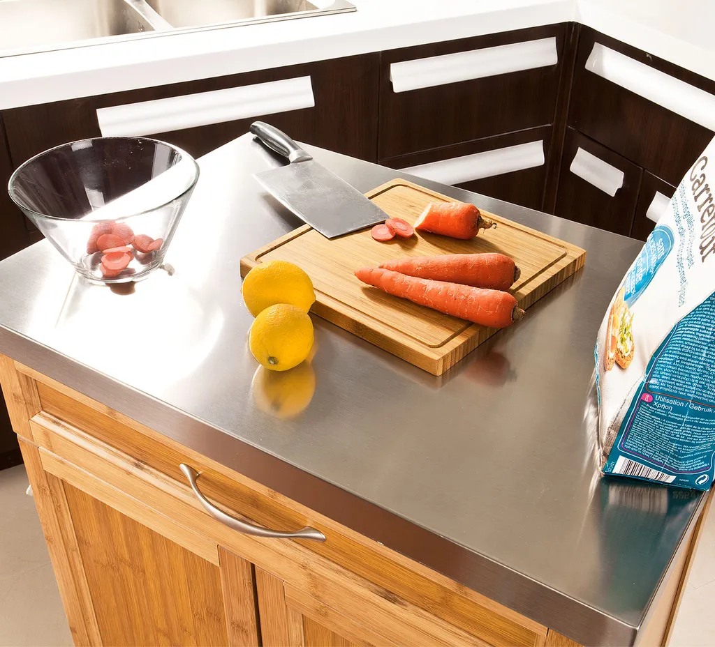 Die Arbeitsfläche aus Edelstahl bietet viel Platz zum ablegen und zubereiten von Lebensmitteln.