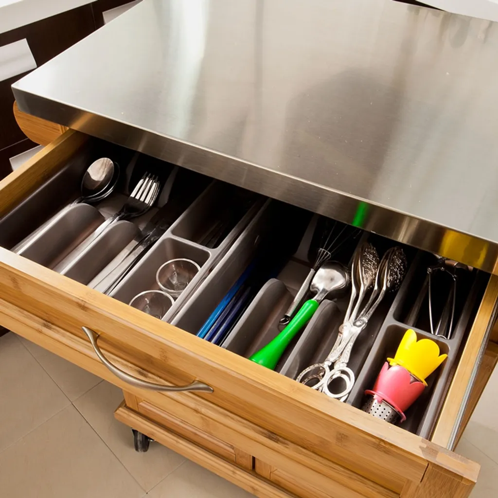 Der Küchenwagen hat vier große, stabile Gummirollen, auf denen sich der Küchenwagen leicht auf jeder Oberfläche verschieben lässt.