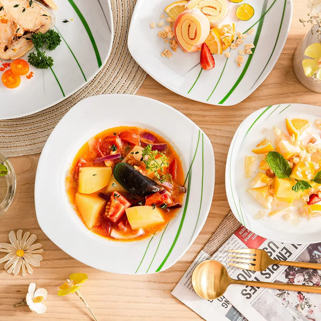 - Im 100-teiligen Set enthaltend: 12 Speiseteller (L 24,7 x B 24,7 x H 2,2 cm), 12 Dessertteller (L 19,2 x B 19,2 x H 2 cm), 12 Suppenteller (180 ml, L 21,5 x B 21,5 x H 3,8 cm), 12 Müslischalen (440 ml, L 17 x B 17 x H 5 cm), 12 Kaffeebecher (350 ml, Ø 8,6 x H 10,2 cm), 12 Eierbecher (Ø 4,8 x H 6,8 cm), 12 Kaffeetassen (220 ml, Ø 8 x H 6,7 cm), 12 Untertassen (L 14,7 x B 14,7 x H 1,7 cm), 2 Milchkännchen (180 ml, 11,5 x 7,5 x 8,5 cm), 2 Zuckerdose mit Deckel (250 ml, 9,5 x 9,5 x 10,5 cm).
