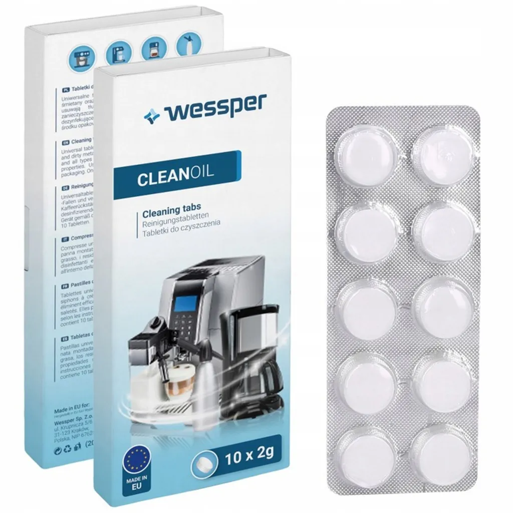 - Wessper CleanOil 10 x 2g Tabletten zur Reinigung / Entfettung von Espressomaschinen, Filterkaffeemaschinen, Milcherhitzern, diversen Haushaltsgeräten, Schlagsahnefängern, Metallgegenständen und Goldschmuck.